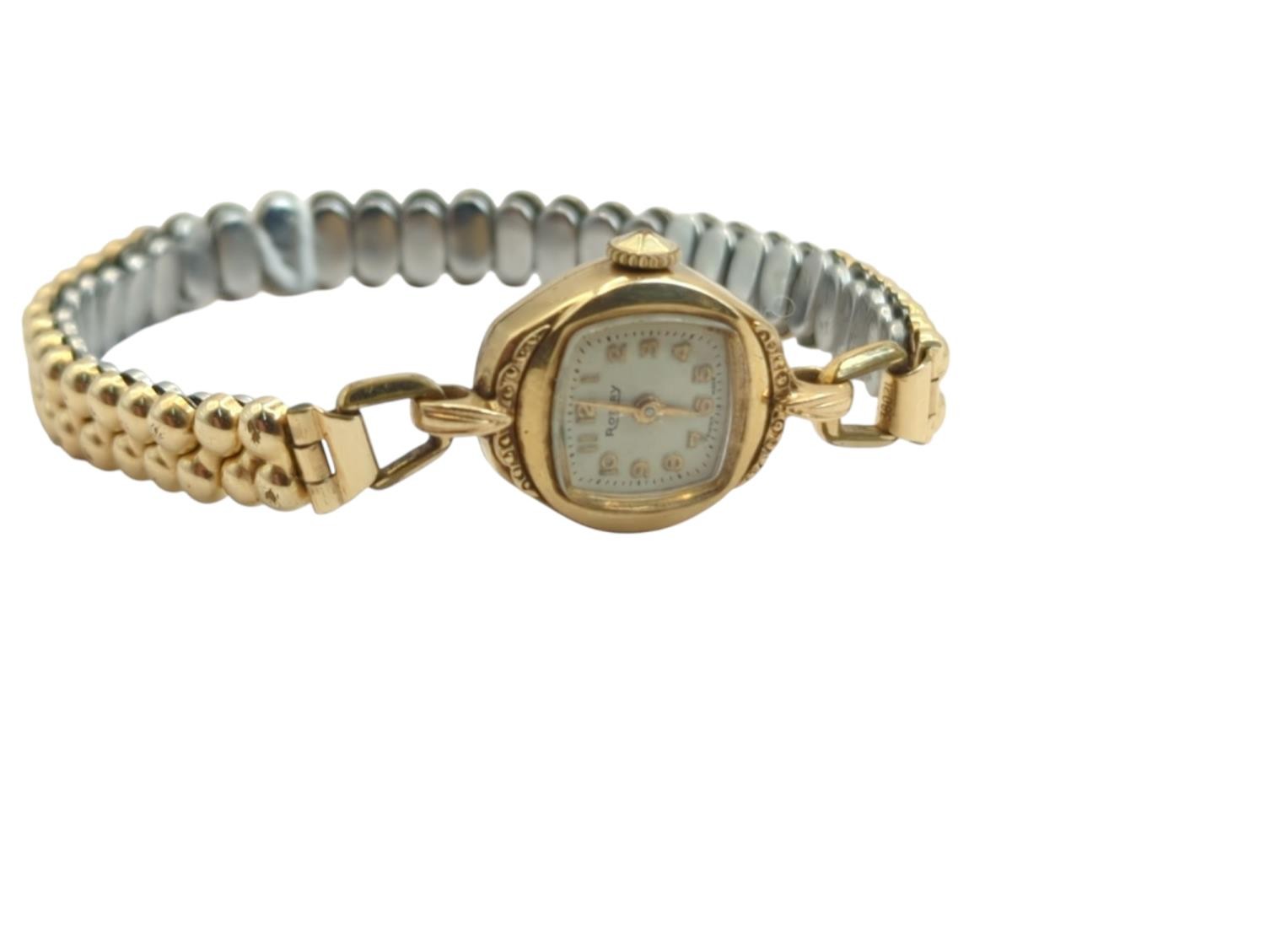 9ct gold cased Rotary ladies watch, the dial with applied Arabic numerals, cal. 955, 15 jewels, inside case hallmarked SD, London 1963, with an Excalibur rolled gold fronted expanding strap