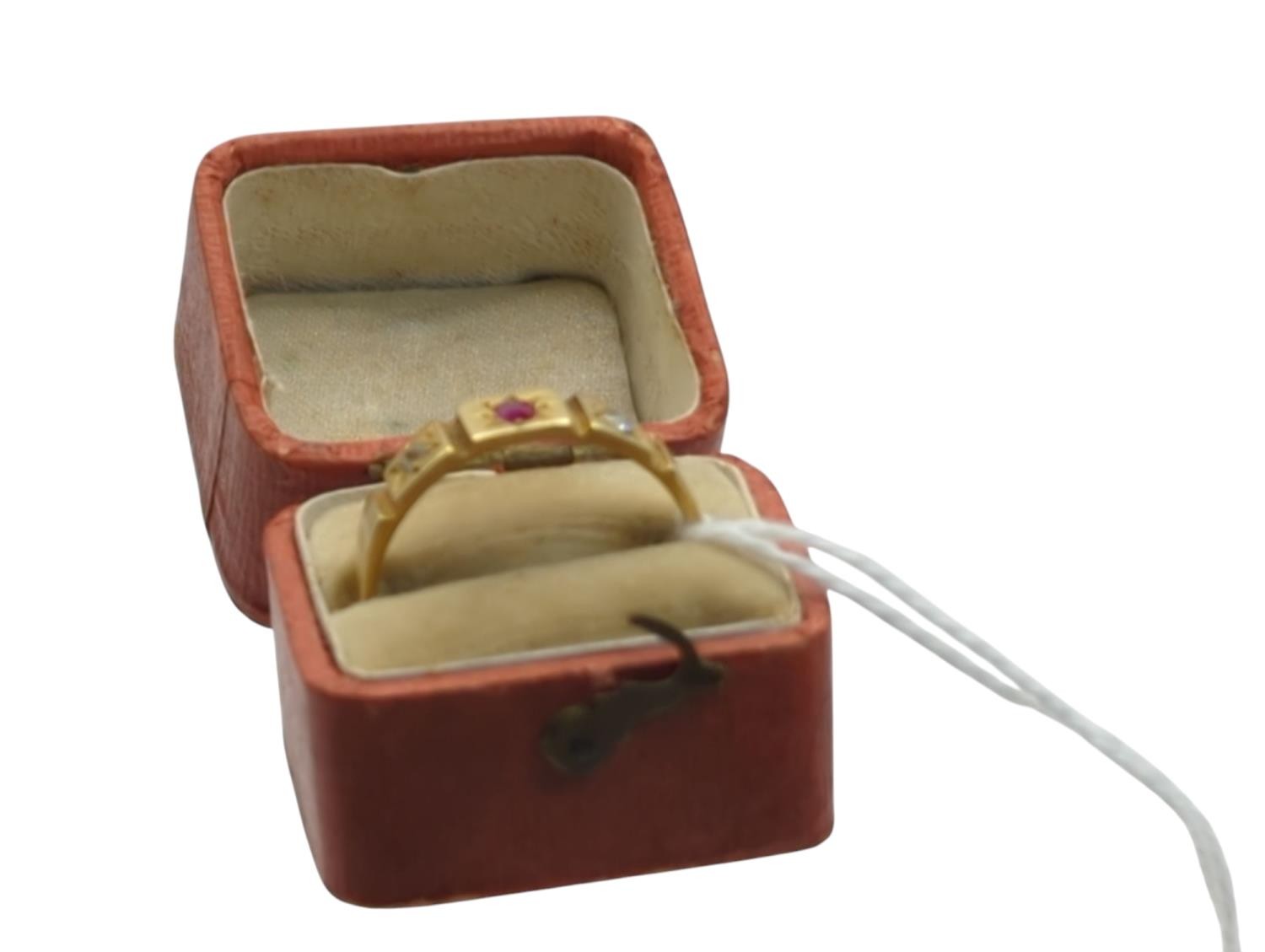 Yellow metal, red stone and diamond ring, red stone testing as ruby, stamped 18, size R1/2, gross weight 2.86 grams