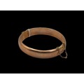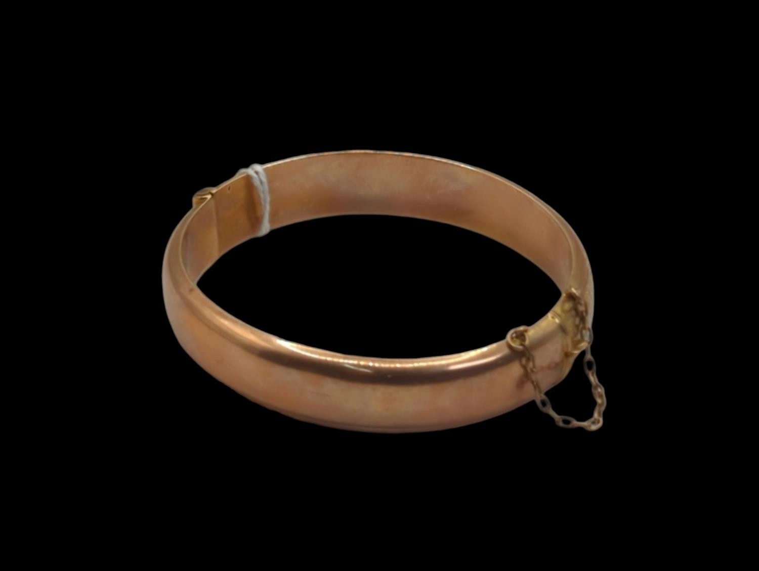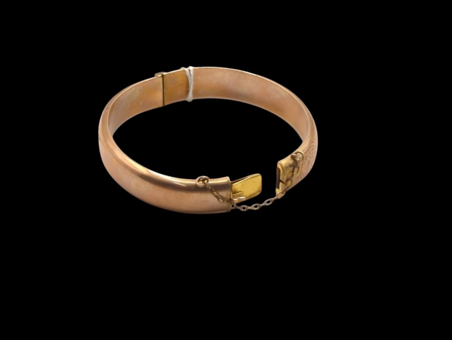 9ct rose gold hinged bracelet, hallmarked Birmingham 1920, with safety chain, foliate engraved pattern to one side, inner width 60mm, 13.83 grams