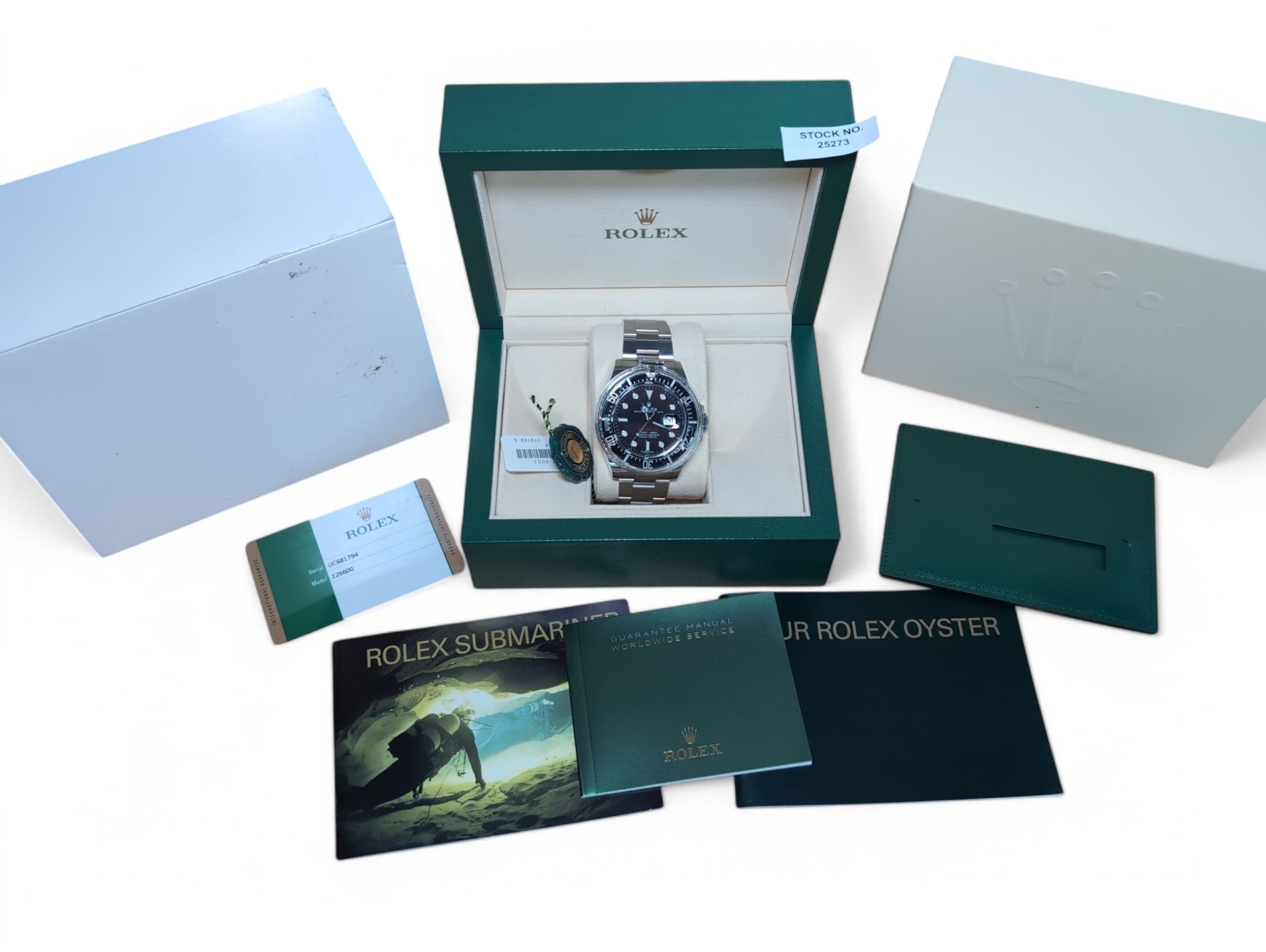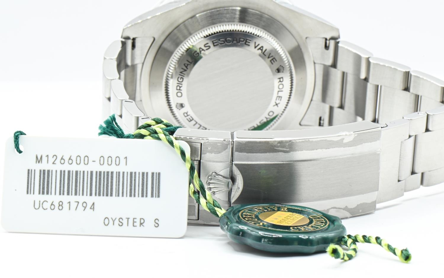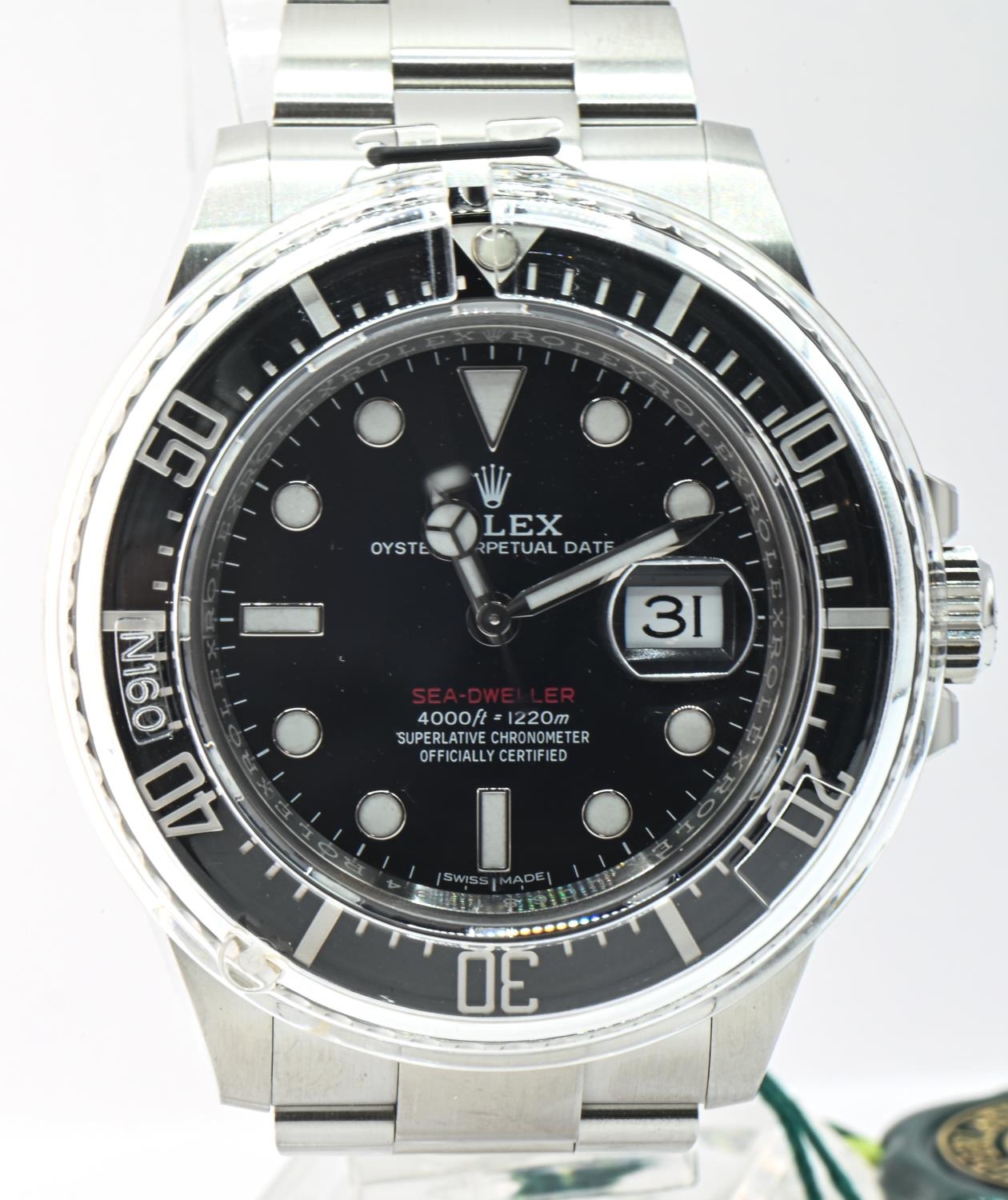 Rolex Sea-Dweller 50th anniversary ref 126600 stainless steel wristwatch with date and bracelet, circa 2017, case no UC681794, black dial, accompanied by Rolex guarantee card, three booklets, card holder, swing tag, presentation box, outer box and sleeve