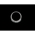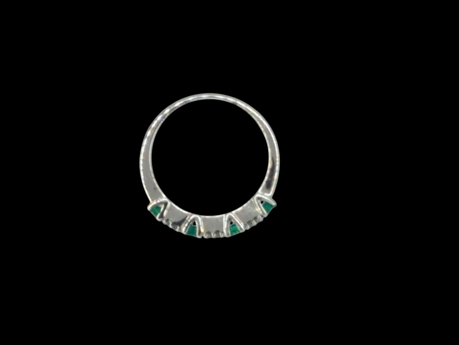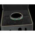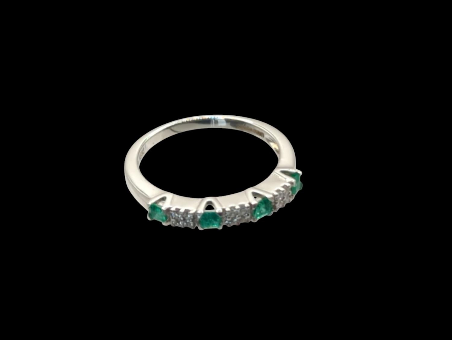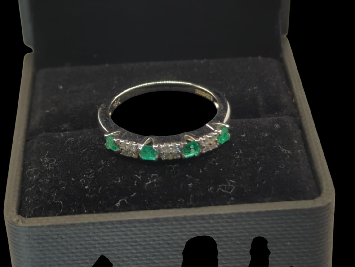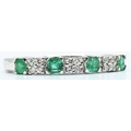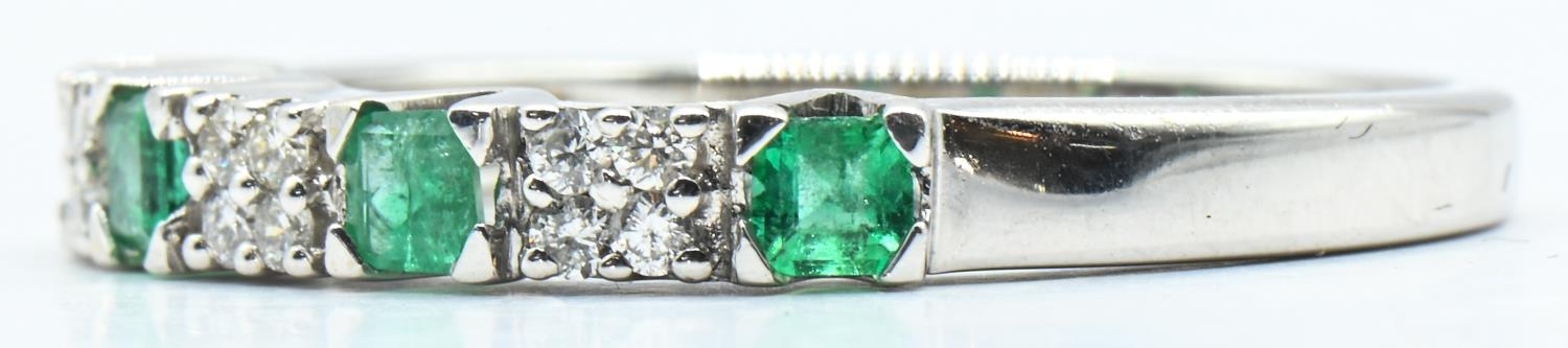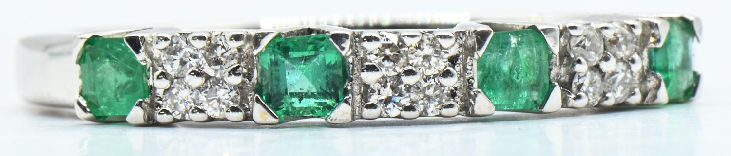 18ct white gold, emerald and diamond half hoop ring, European convention mark and hallmark, size O1/2, gross weight 3.1 grams