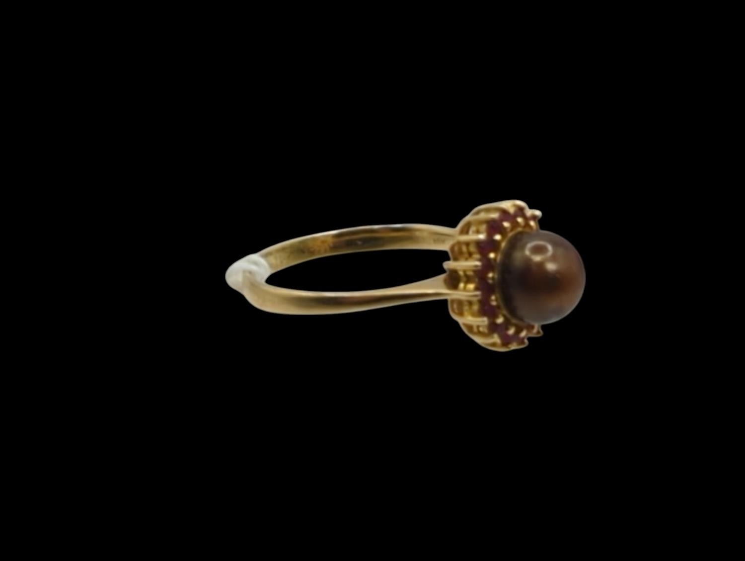 Brown pearl and red stone cluster ring, in a yellow metal mount stamped 18K and 750, size T, gross weight 4.7 grams